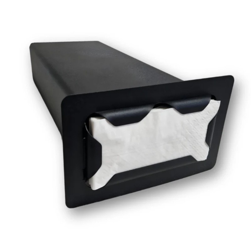 The Built-in Napkin Dispenser is the perfect solution for cafes, self-service restaurants, and food courts where every inch of workspace counts. The 1 mm steel body integrates into furniture, keeping counters clear for drink preparation and order fulfillment. The black powder coating protects against scratches and corrosion, maintaining an attractive appearance even with heavy use.