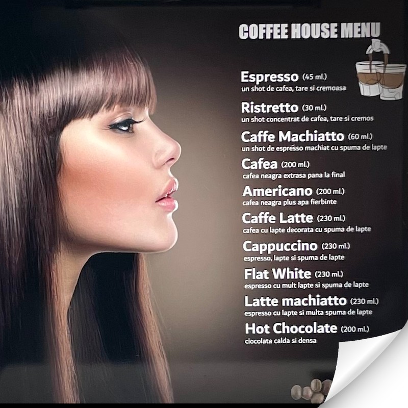 Printed sticker with coffee menu, for application on the back of coffee serving furniture.